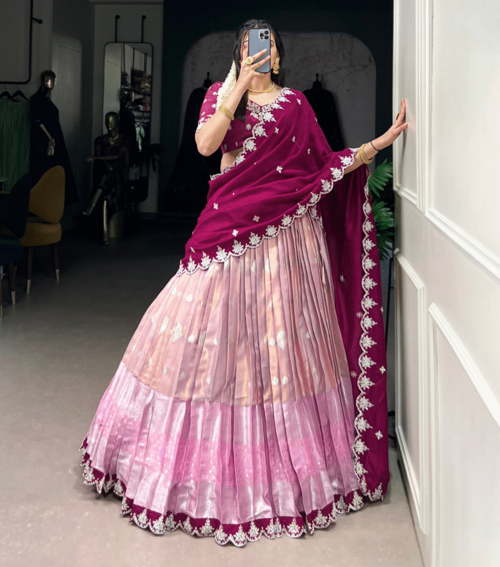 Lehenga Work : Zari Weaving Work With Sequins and Thread Embroidery Scallop Lace Border